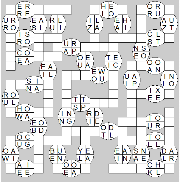 The only clues you have are the letter pairs we've given you in the grid. Each answer consists of a pair of words that share the letters that you'll write in the empty squares. In the example we've given you, we've filled in the letters S, E and W to make SINEW and SCREW. A few of the entries may have more than one possible answer, but only one will fit correctly with the rest of the puzzle.