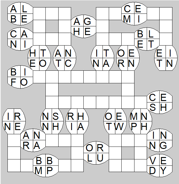 The only clues you have are the letter pairs we've given you in the grid. Each answer consists of a pair of words that share the letters that you'll write in the empty squares. In the example we've given you, we've filled in the letters S, E and W to make SINEW and SCREW. A few of the entries may have more than one possible answer, but only one will fit correctly with the rest of the puzzle.